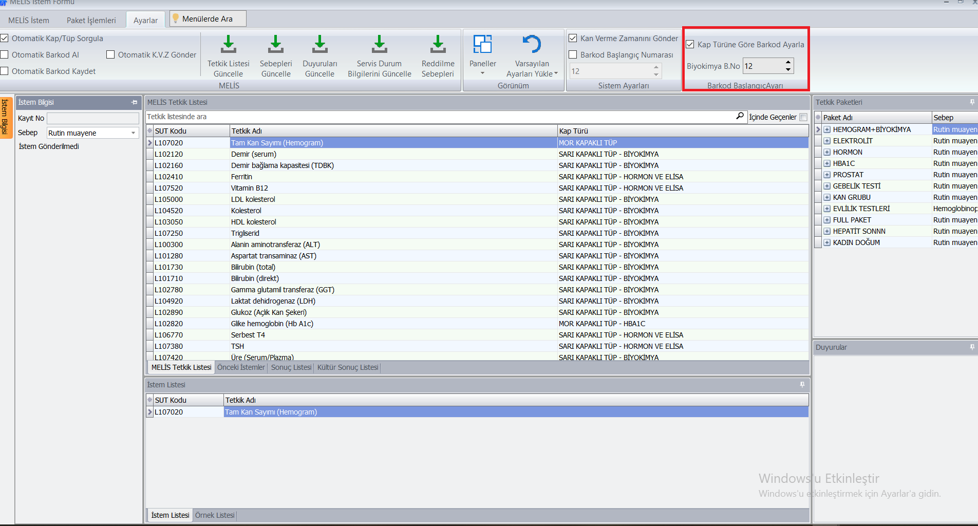 NOT:Tetkik ekranı > Ayarlar > İşlemleri >Kap türüne Göre Barkod Ayarla kutucuğu işaretlenerek biyokimya barkod numarası giriir ve Enter tuşuna basılır.